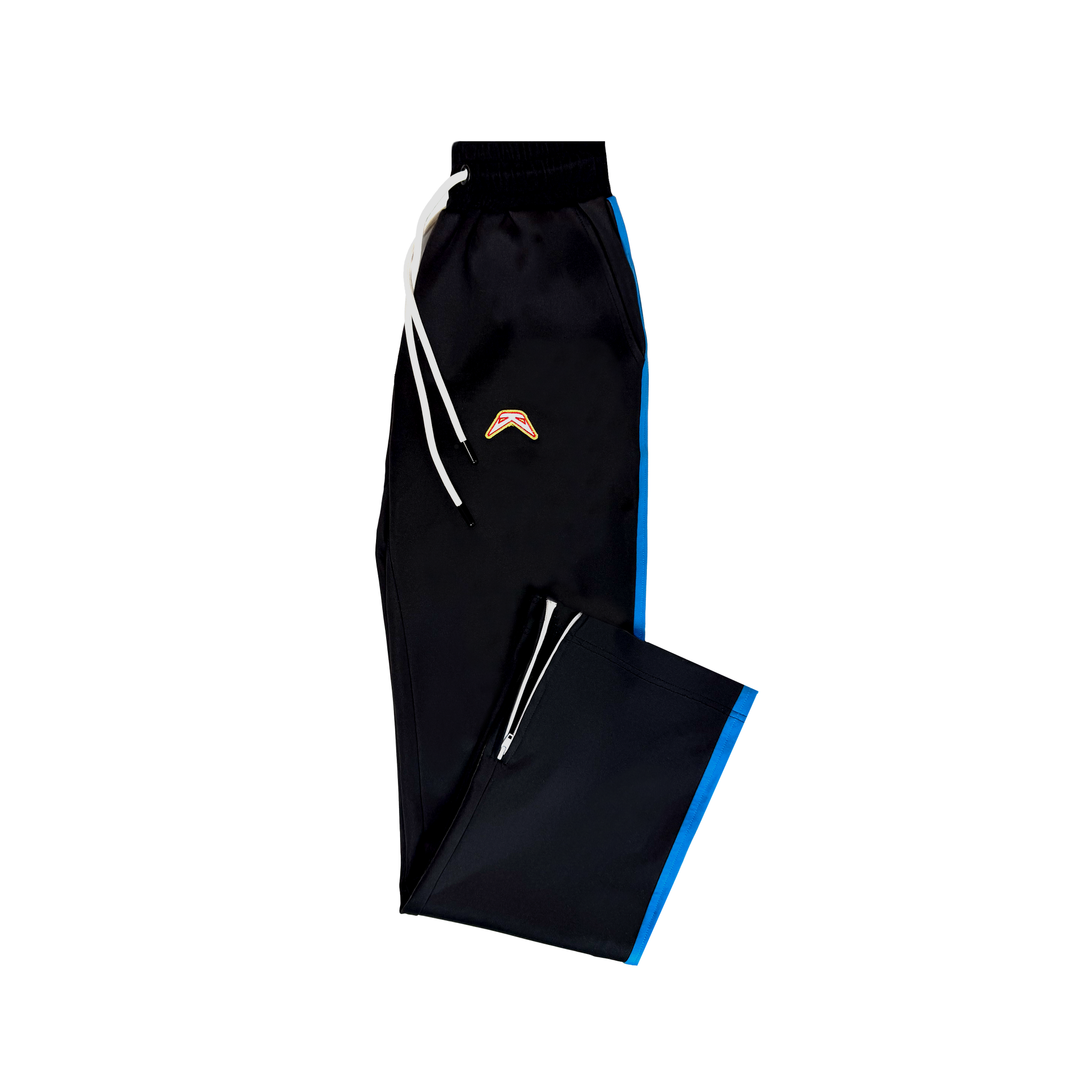 A refined take on the classic track pant, the Dream Suit Bottoms combine athletic ease with tailored precision. Crafted from premium tricot fabric with a smooth, structured hand feel, the silhouette is straight and relaxed through the leg, finished with zipped hems for versatile styling. Electric blue panelling runs cleanly down the side seams, framing the shape with bold contrast, while a white drawcord adds a crisp accent at the waist. The front is finished with the embroidered Dreamers chevron emblem — a subtle signature detail.