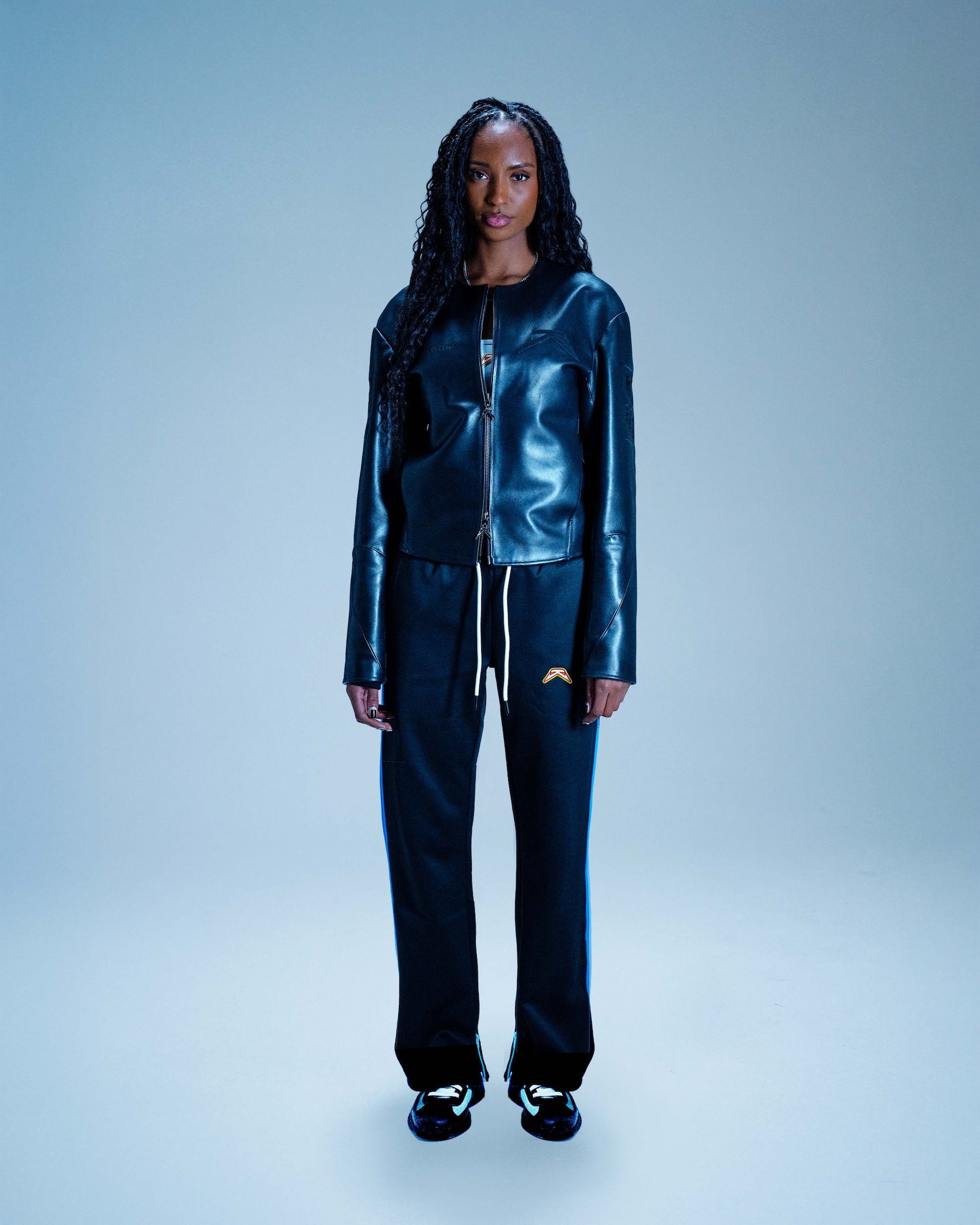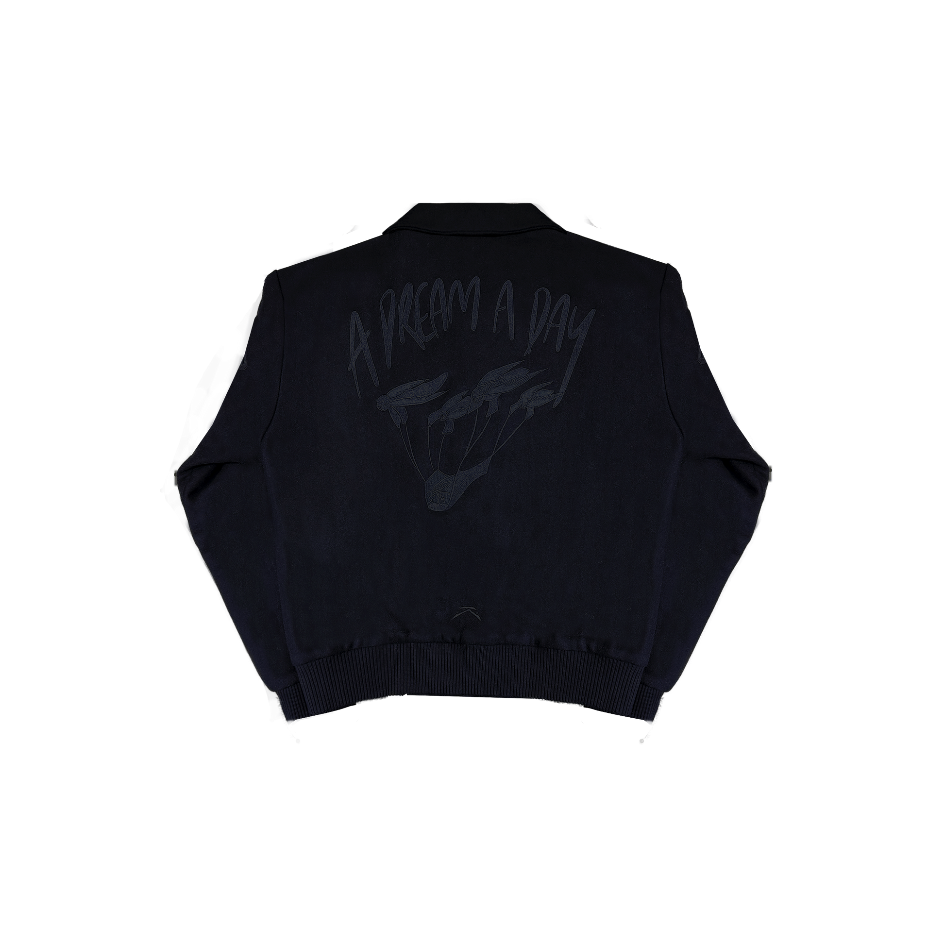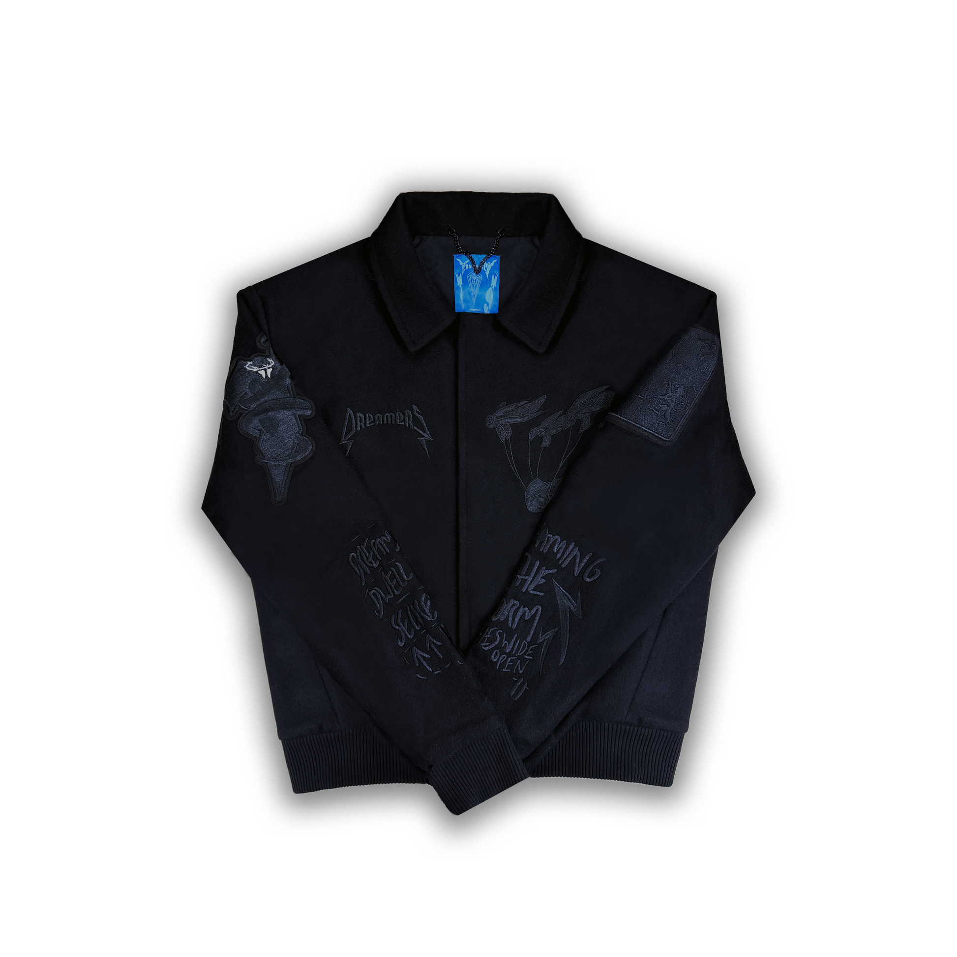 A refined reinterpretation of a timeless silhouette, the STORM Varsity Jacket embodies the house’s elevated streetwear codes. Crafted from premium heavyweight Melton wool with a smooth lining, it warms whilst maintaining breathability. The jacket features tonal black embroidery and appliqué detailing across the chest, arms, and back — including the Dreamers insignia and hand-drawn motifs — creating a subtle play between texture and depth. Finished with a pointed collar, concealed snap closure, and ribbed cuffs and hem, it merges artisanal craftsmanship with a contemporary edge.